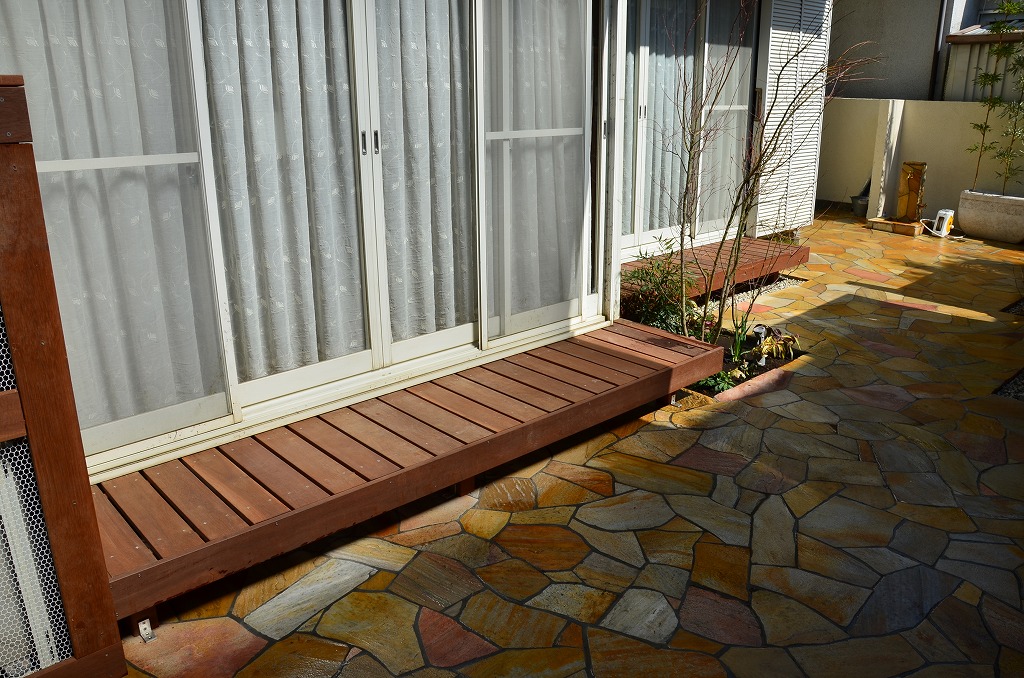 枕木部分を耐久性の高いレンガにて作り替え。お風呂の前はウリン材フェンスで目隠ししました。